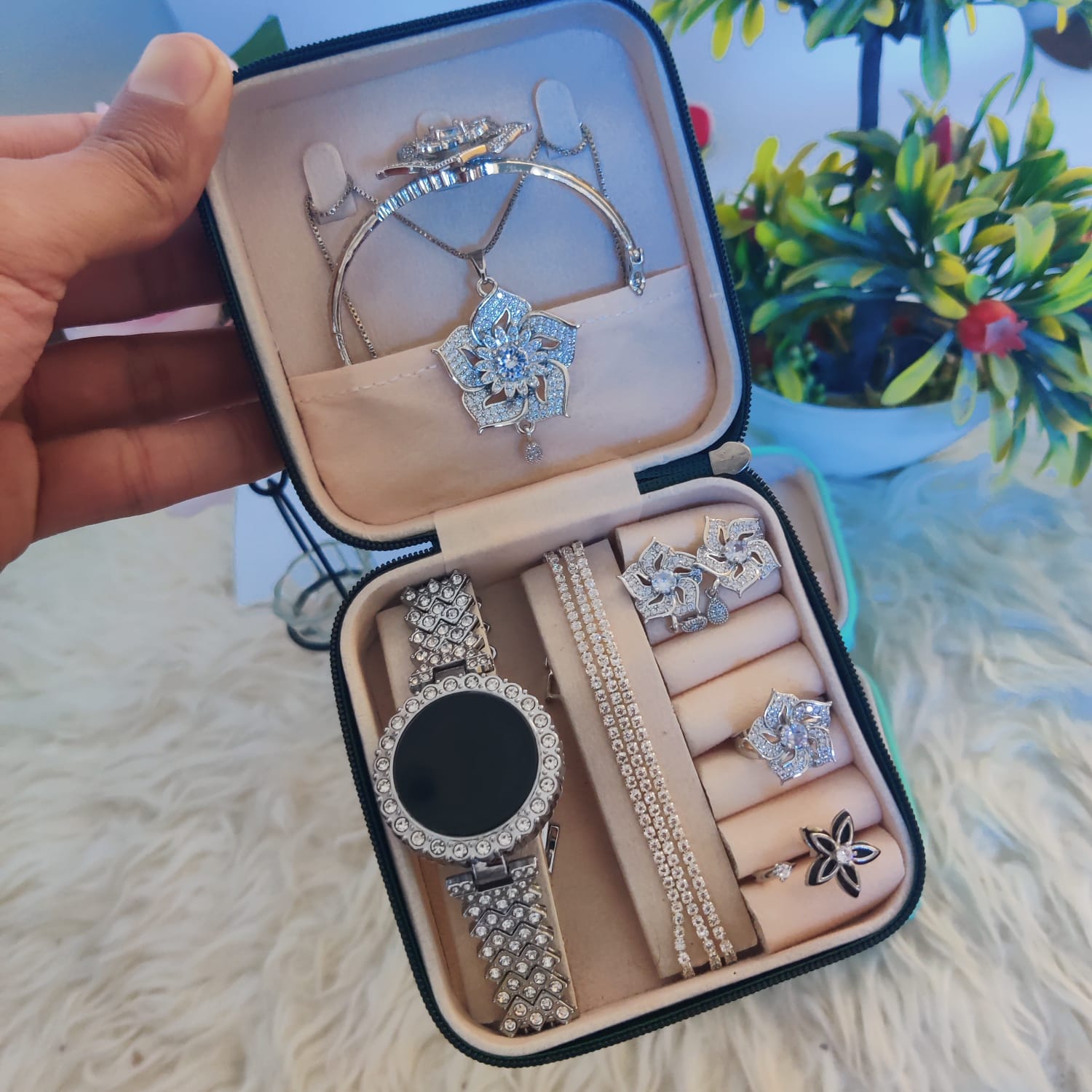 Set Includes: 1. 1x Stylish Digital Watch 2. 1x Pendant Necklace 3. 1 Pair of Matching Earrings 4. 1x Matching Ring 5.1x Matching Rotating Ring 6. 1x Crystal Bracelet