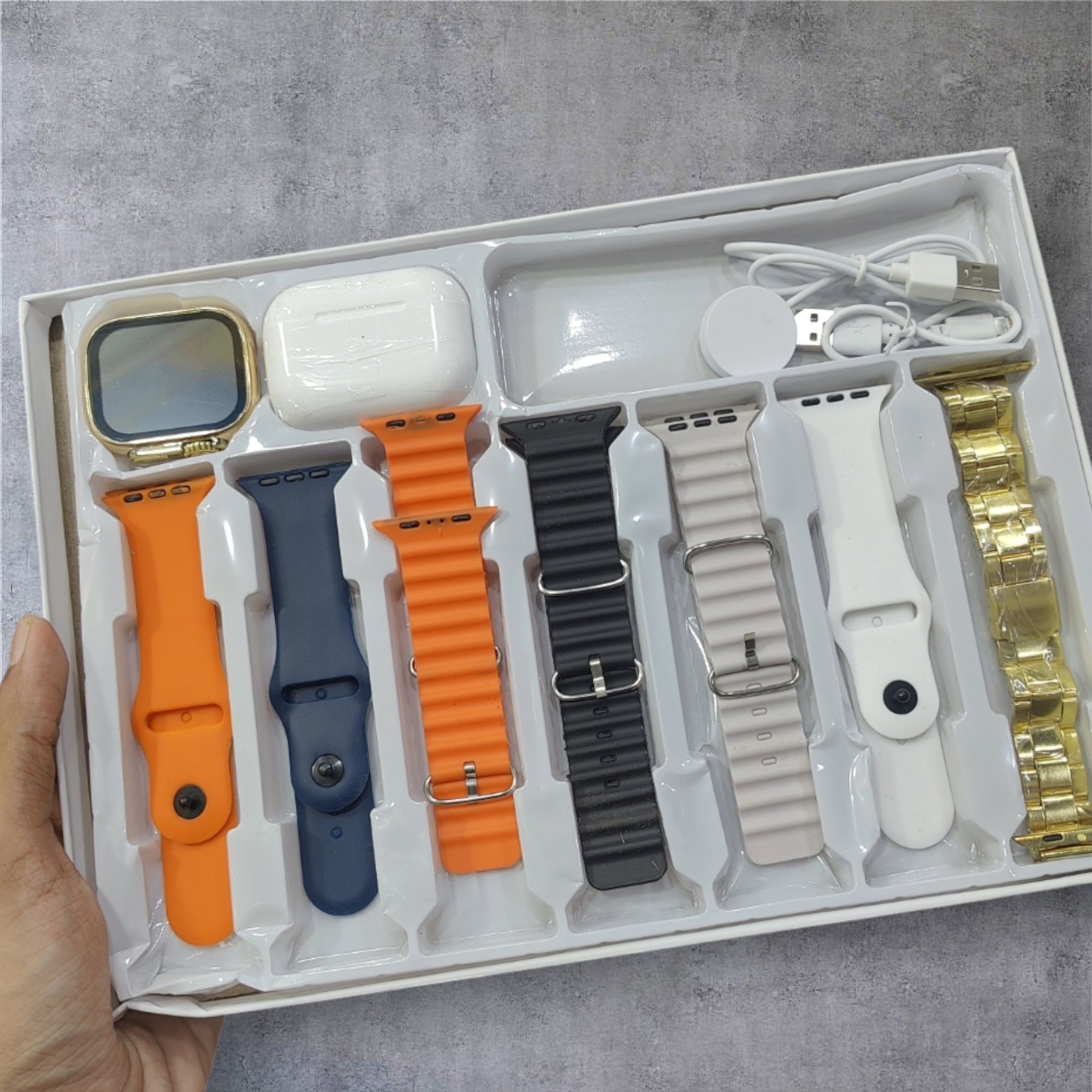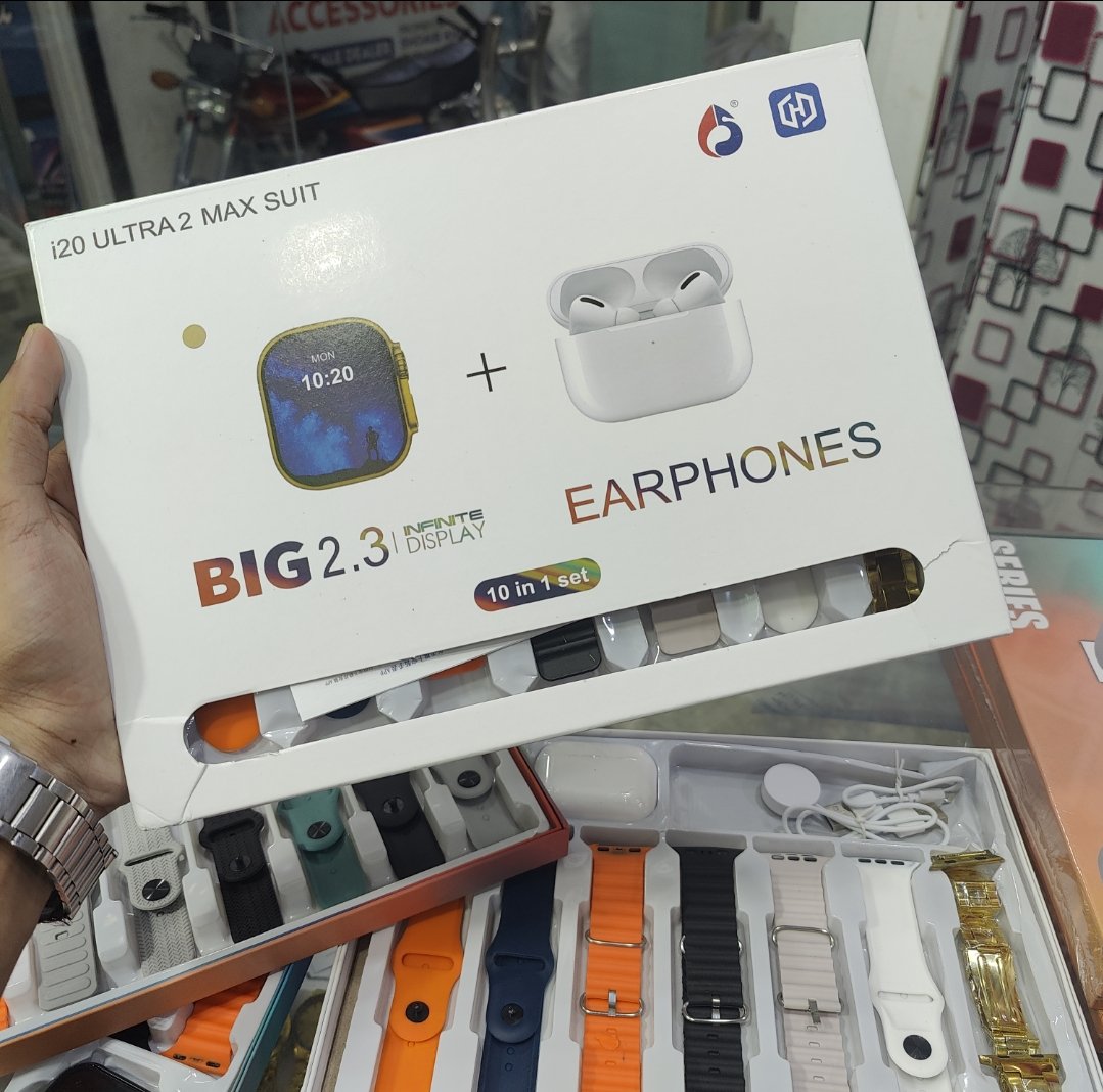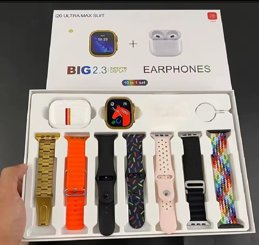 • I20 Ultra Max Suit 10 in 1 Set: This package includes a smartwatch, 7 interchangeable straps, a jelly watch case, and AirPods Pro with wireless charging capabilities.